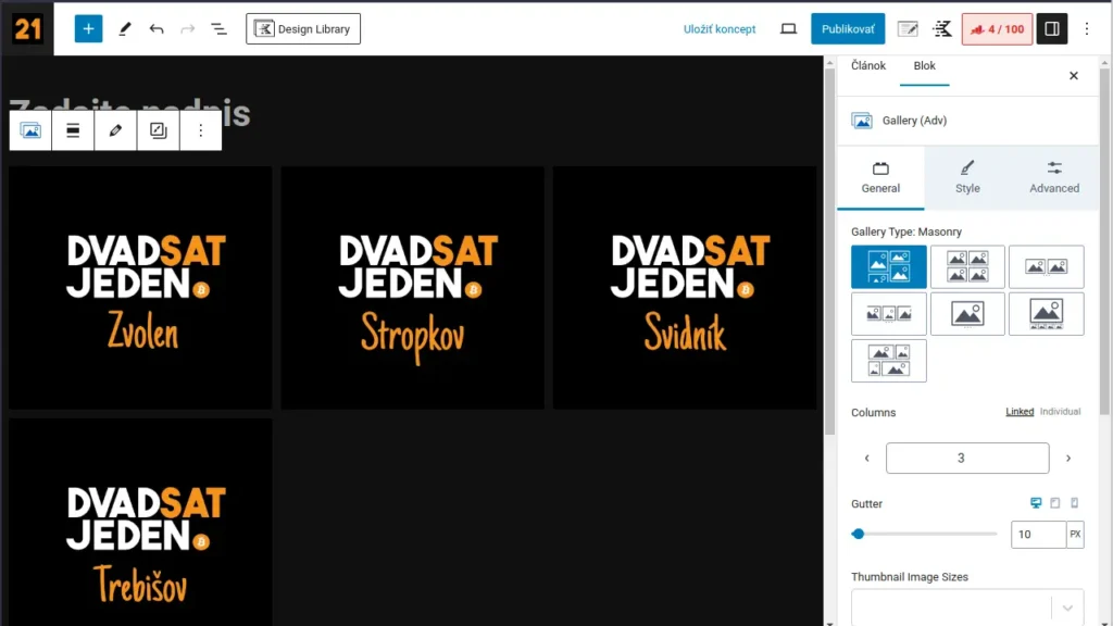 Galériu vkladáš podobne ako samostatný obrázok, len volíš „modrú“ ikonku „Gallery (Adv)“ a naraz pridávaš viac obrázkov.